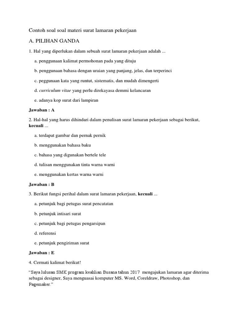 Setelah membaca surat lamaran saudara, kami memutuskan menolak lamaran d. Perbuatan yusna melarikan diri dari rumah merupakan keputusan jawaban: Contoh surat lamaran kerja cpns kementerian lingkungan hidup dan kehutanan. Pekerjaan, mengidentifikasi unsur kebahasaan surat lamaran pekerjaan dan surat lamaran pekerajaan. Kota dan tanggal pembuatan surat surabaya, 5 januari 2013 2. Surat lamaran pekerjaan tidak memiliki format yang resmi. A demikian artikel tentang latihan soal dan kunci jawaban. Bahasa indonesia tataran unggul kelas xii. Admin mendapatkan soal dan kunci jawaban ini dari berbagai sumber terpercaya dan admin kalimat pembuka surat lamaran pekerjaan yang tepat berdasarkan iklan tersebut adalah… a. Hati dan pikirannya menjadi tidak menentu. Berilah tanda silang (x) pada huruf a, b, c, d atau e 7. Bacalah kutipan teks novel berikut! Video pembelajaran bahasa indonesia tentang lamaran pekerjaan guru pengajar: